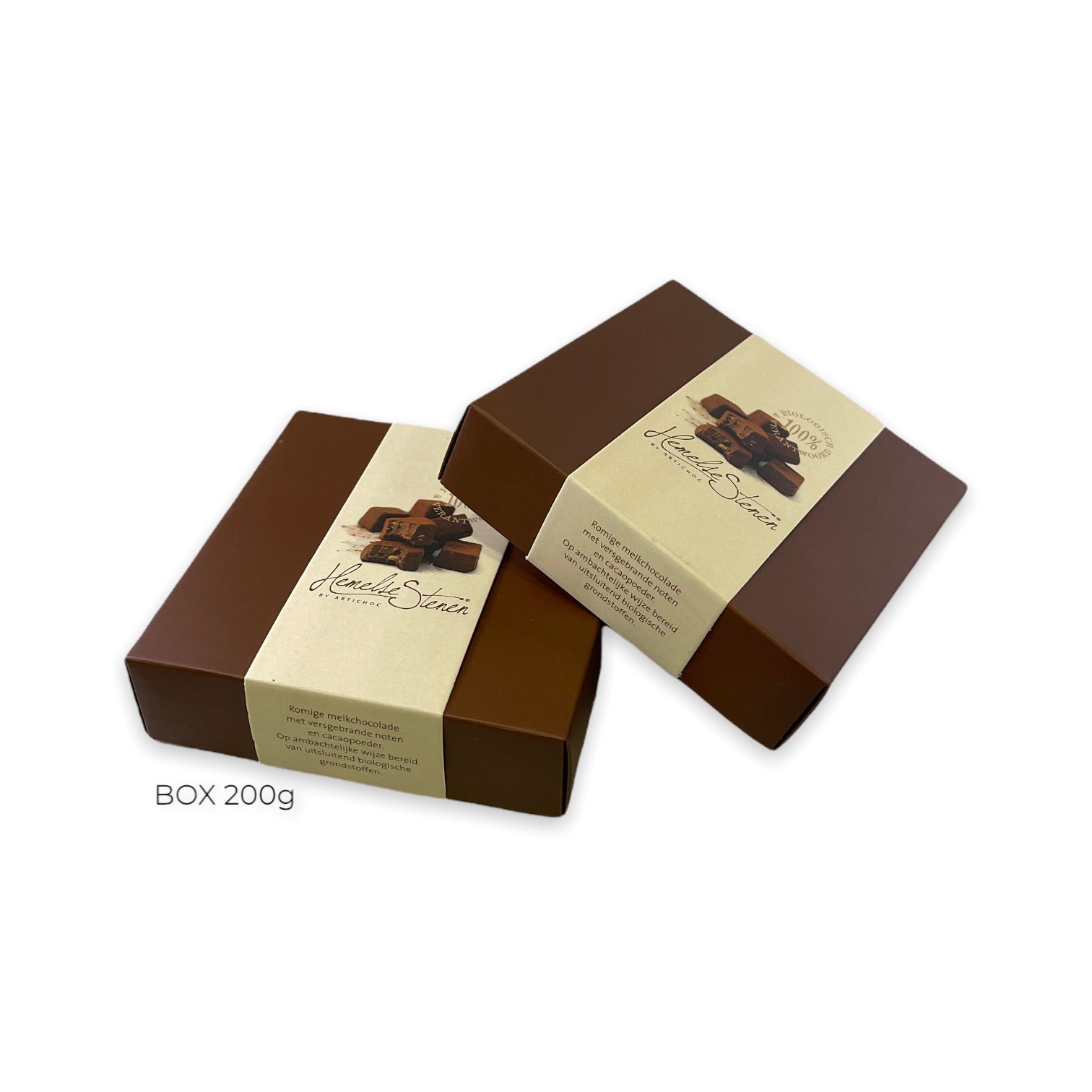 Onze Hemelse Stenen® op basis van zachte chocolade met vers geroosterde noten snijden wij allemaal met de hand waarna ze door de cacaopoeder gerold worden.