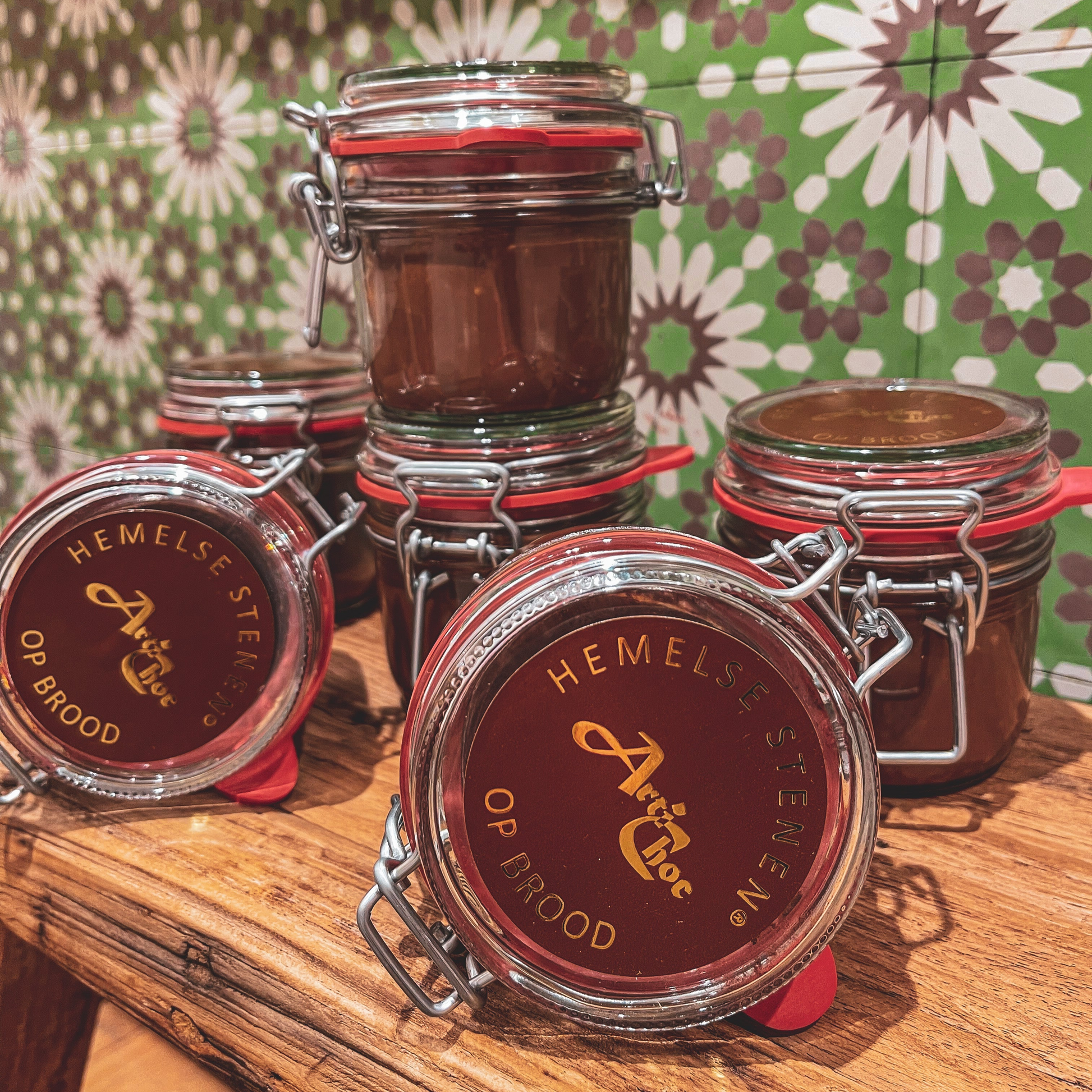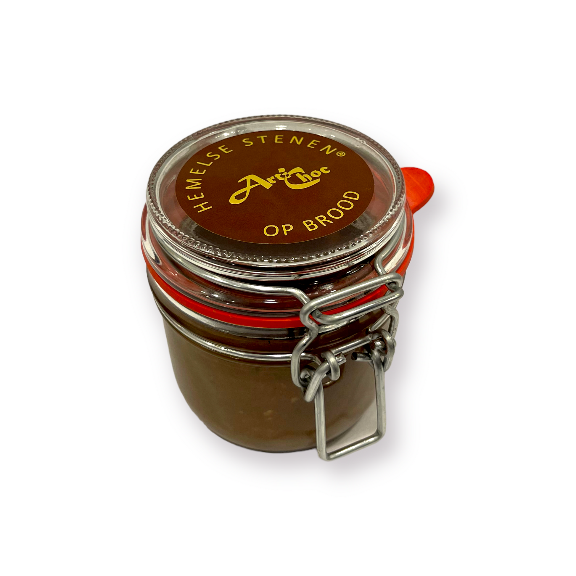 Onze bekende Hemelse Stenen zijn nu verkrijgbaar voor op brood! Een smeuïge chocolade pasta gemaakt van onze heerlijke chocolade met geroosterde noten, bestrooid met cacaopoeder. Smeer het op je brood. Of gebruik gewoon een lepel. 😋