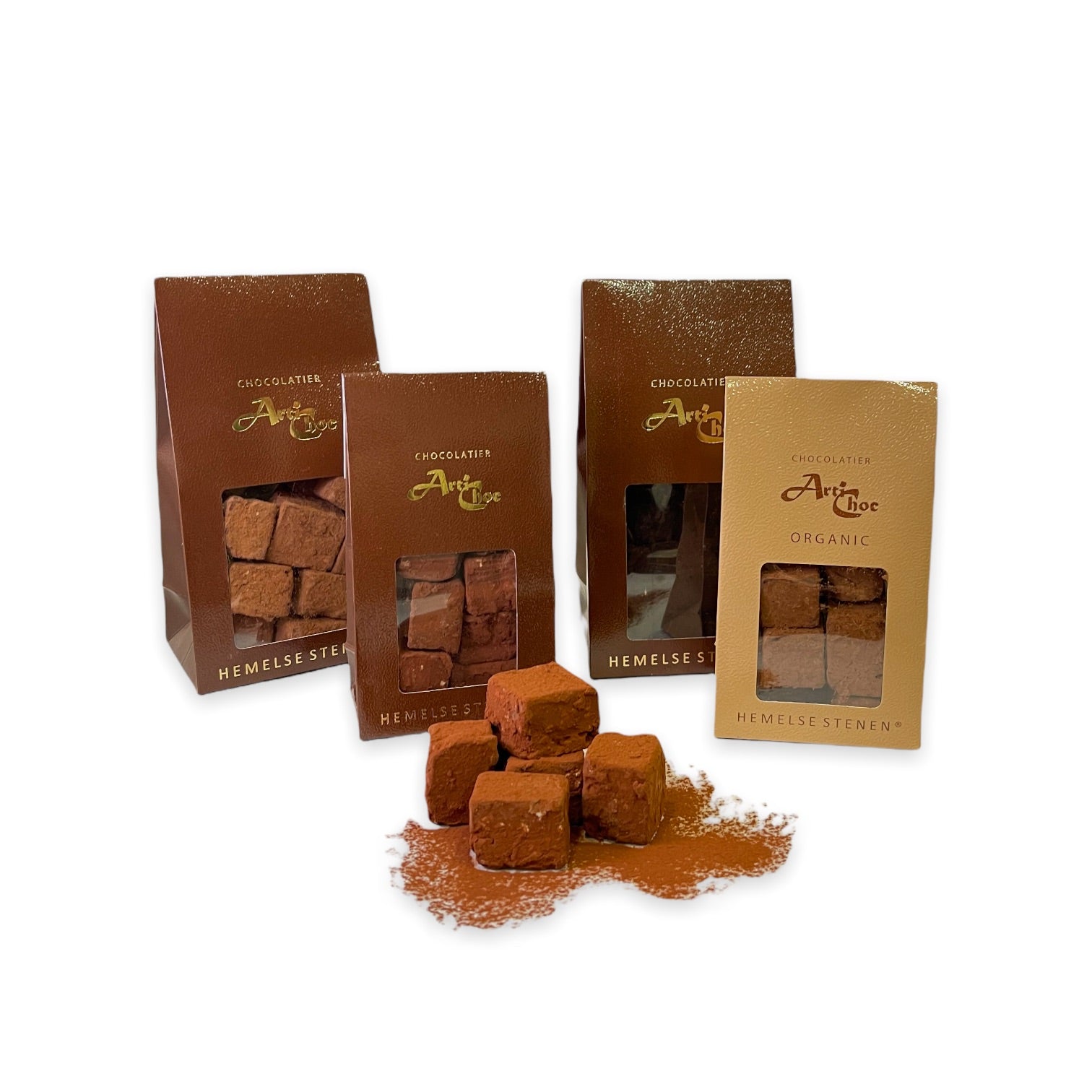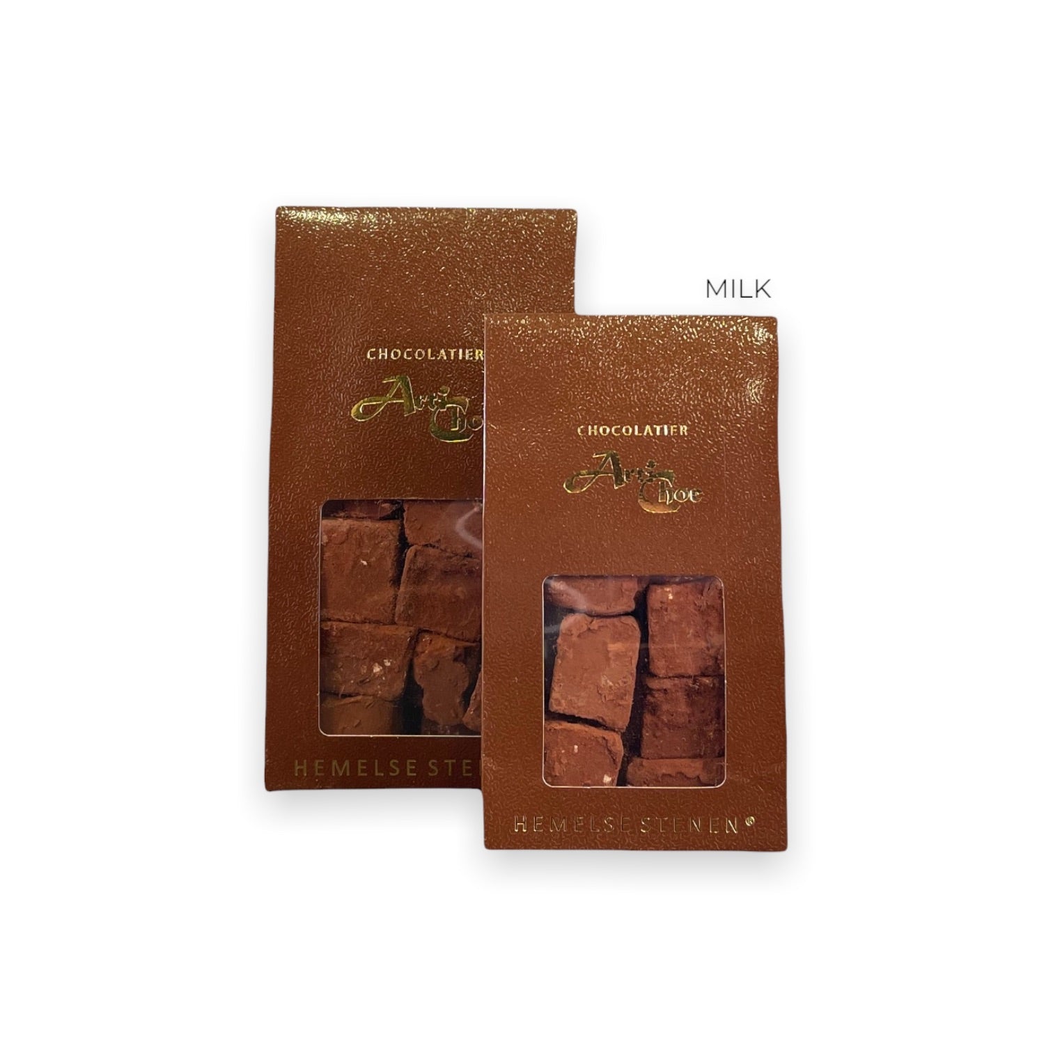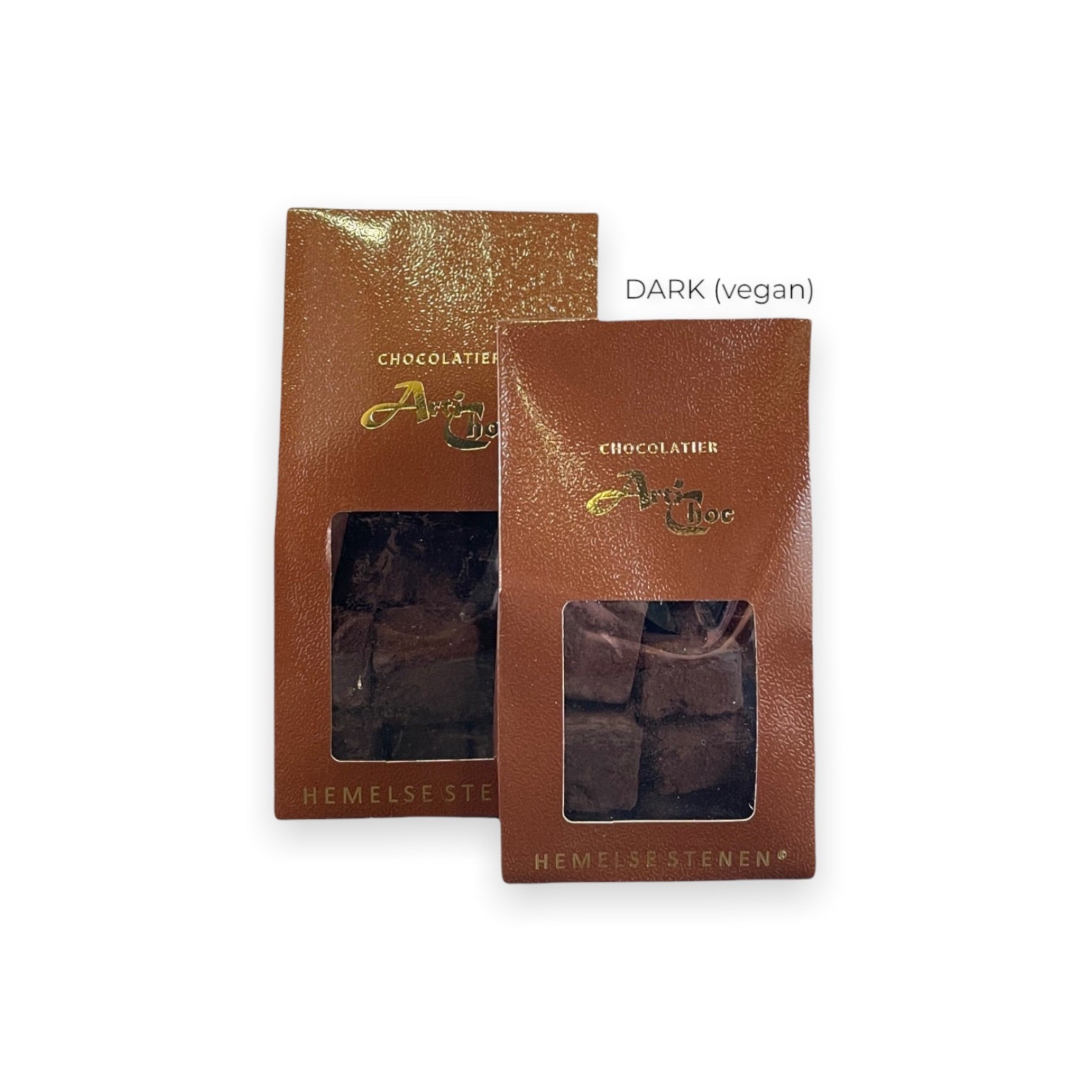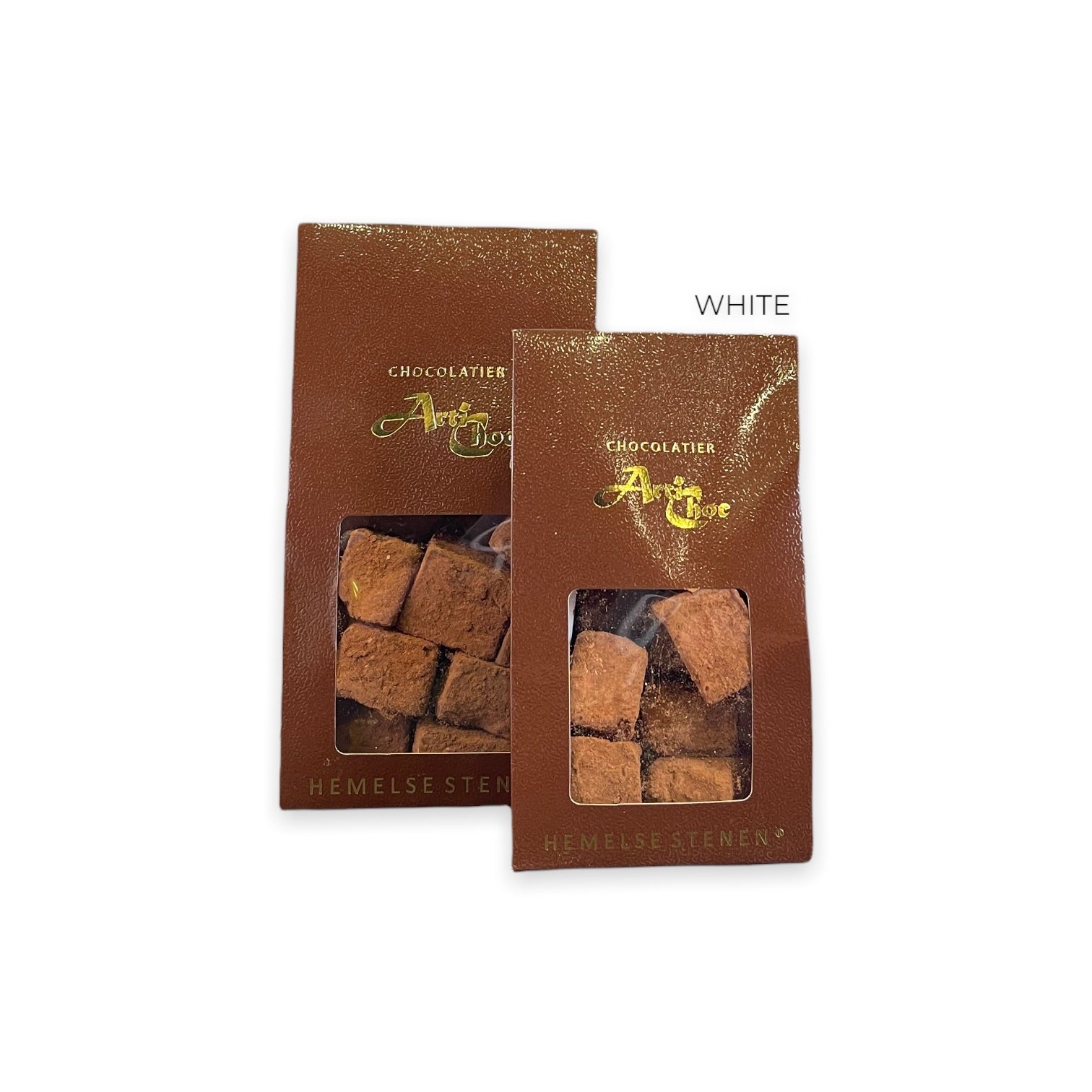 Grof gesneden stenen gemaakt van een overheerlijke zachte chocolade met geroosterde noten, bedekt met cacaopoeder. De Hemelse Stenen zijn mooi verpakt in luxe bruine zakjes, keuze uit 100g en 200g.