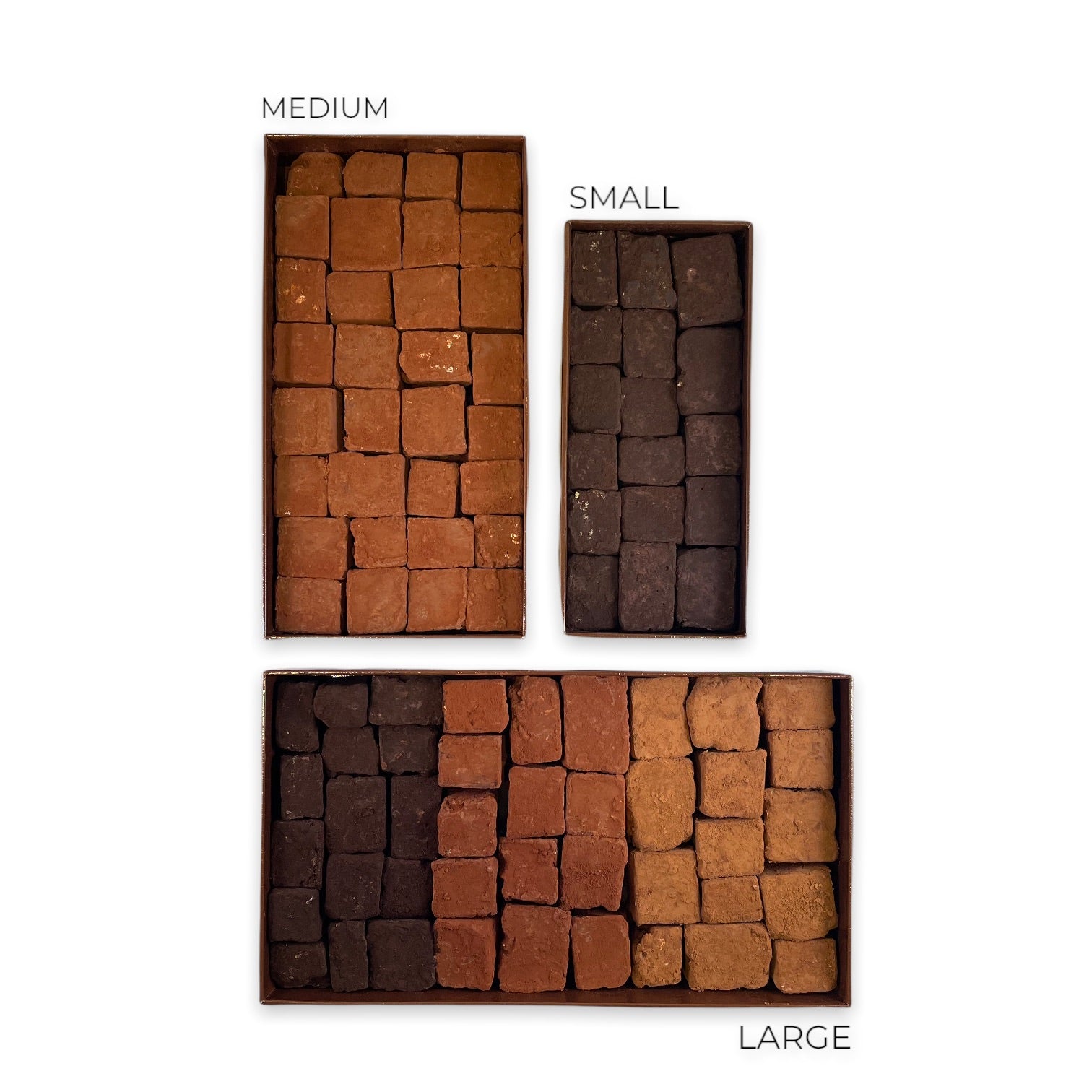 We hebben drie verschillende smaken: melk, puur (vegan) en witte chocolade. Ook kunt u kiezen voor een gemengde doos.