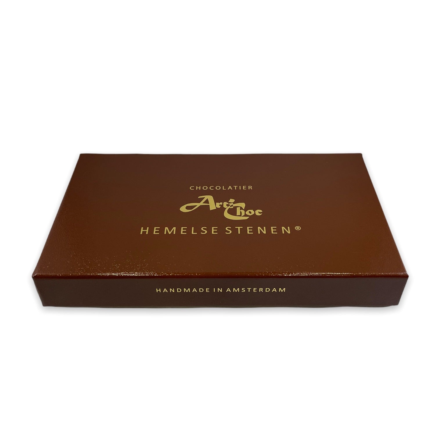 Grof gesneden stenen gemaakt van een overheerlijke zachte chocolade met geroosterde noten, bedekt met cacaopoeder. De Hemelse Stenen zijn mooi verpakt in luxe dozen. Keuze uit ca. 250g, 400g en 550g.